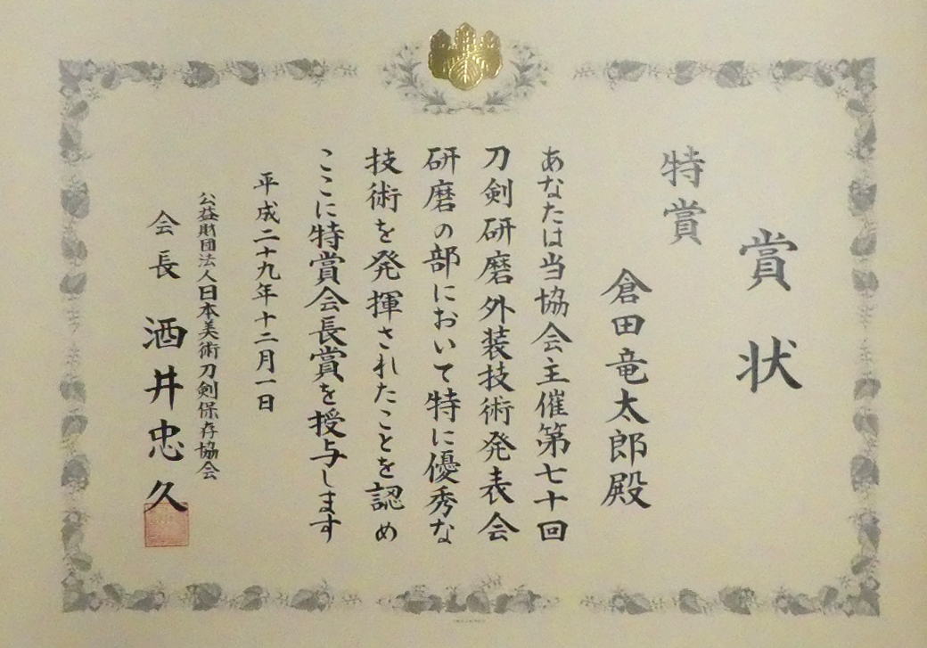 ■平成29年/(公財)日本美術刀剣保存協会主催第70回刀剣研磨・外装技術発表会 日本美術刀剣保存協会会長賞